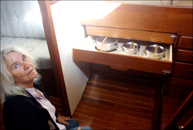 For example, I call Scott’s attention to the clever “en place” pots and pans storage in a cunning drawer beneath the nav station opposite the galley. Mattie tries to scramble out of the frame as I snap, shooting me a dirty look when I catch her. She doesn’t tell me I can’t take her picture, but I have a feeling that if I asked her to pose she’d give me a flat-out “no.” So I don’t ask.