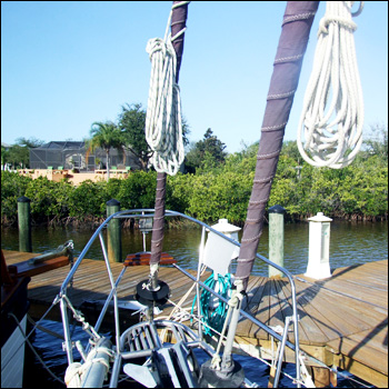 Mattie and Henry keep 2 Extreme at Anclote Isles Marina in Tarpon Springs, Florida, an easy drive from their land home. When the newlyweds decided to go ’round the world’, they sold their house in Summerland Key, but retained the digs up North on Florida’s West Coast near Tarpon Springs. And so it was that Henry and Mattie volunteered to pick us up at Tarpon Springs City Marina on an early December morning for a tour of the 1979 Corbin. We’d already viewed 2 Extreme and her stats on-line.