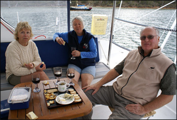 - On the inboard side, fore to aft, we have a refrigerator under the counter top with a work surface and a stainless steel draining board on top. A wooden board fits snugly over the large sink whenever two people are preparing a meal together.